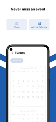NEVER MISS AN EVENT The event section shows a list of events throughout the district. Users can add an event to your calendar to share the event with friends and family with one tap.